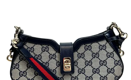 Sac « Moonside » en toile GG Suprême et cuir marine, fermeture éclair, patte sur fermoir…