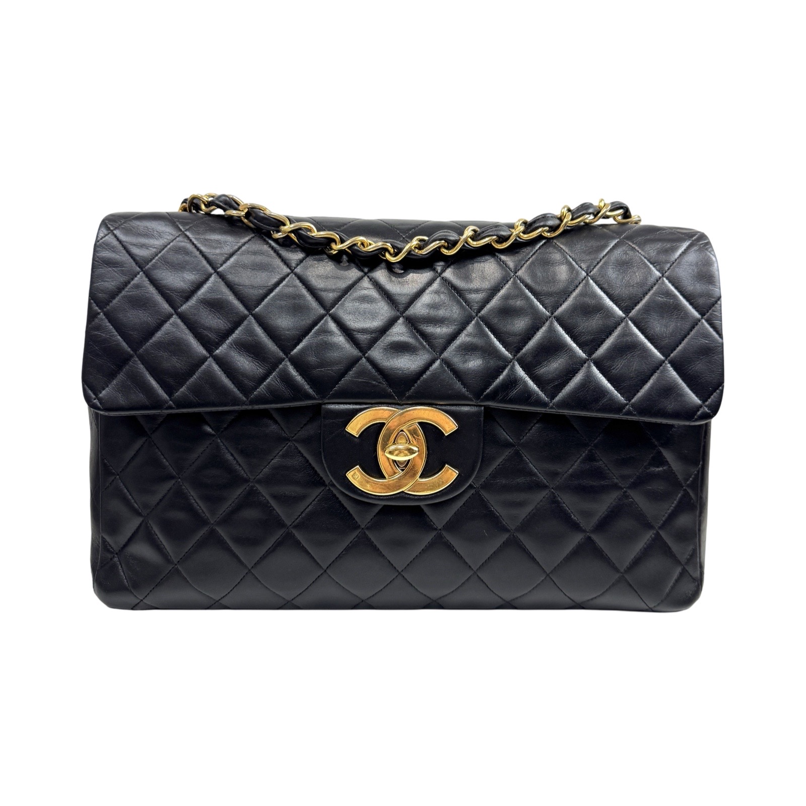 Sac « Maxi Jumbo » en cuir agneau matelassé noir, fermoir « CC », plaqué or sur rabat, anse chaîne bandoulière réglable, poche extérieure. (Hologramme illisible.) En bon état.