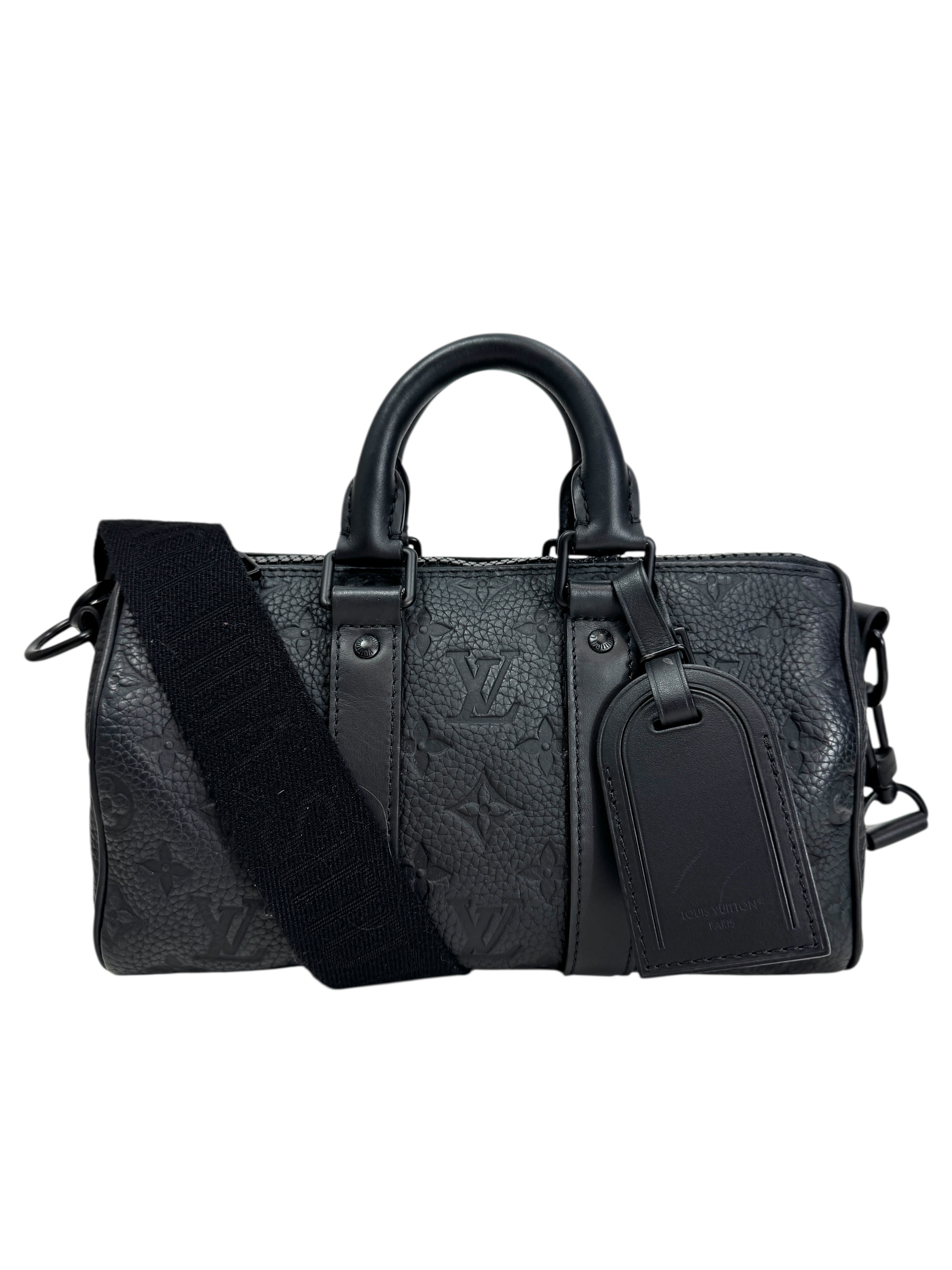 Sac « Keepall bandoulière » 25 en cuir Taurillon Monogram noir, fermeture éclair, double poignée, poche extérieure, et anse bandoulière amovible réglable.