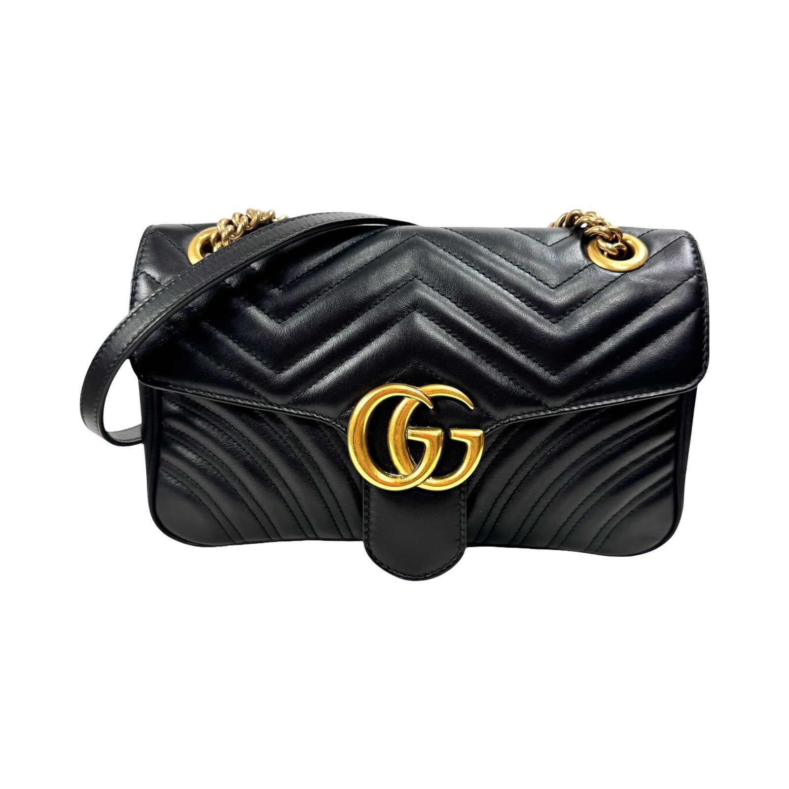 Sac « Marmont » en cuir agneau noir à surpiqures chevron, fermeture pression sur rabat, surmonté du sigle de la Maison en métal doré, anse chaîne réglable, patte d’épaule.