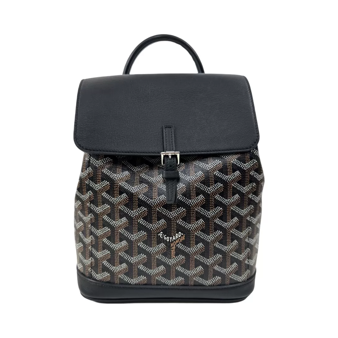Sac à dos « Alpin mini » en goyardine et cuir noir, fermeture languette sur rabat, poignée, bretelles réglables amovibles.
