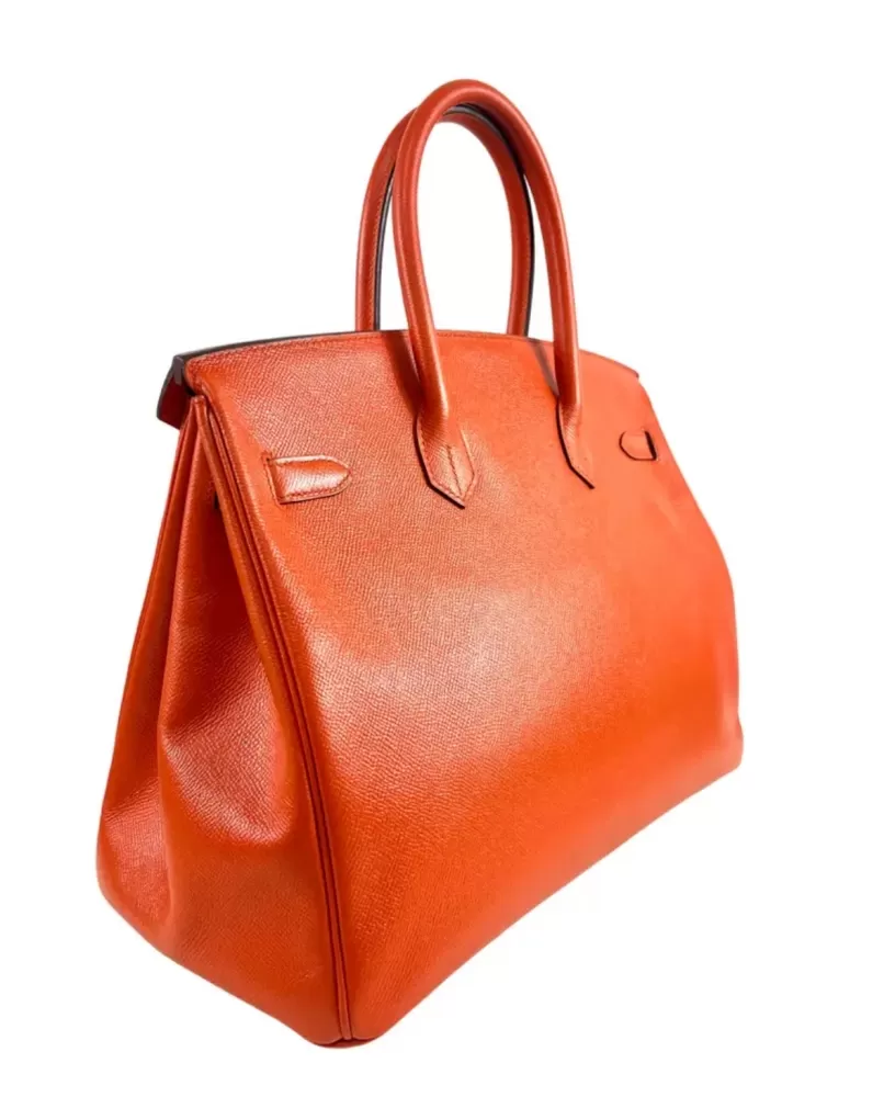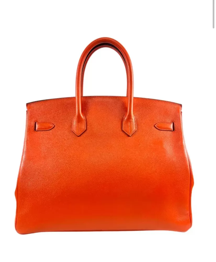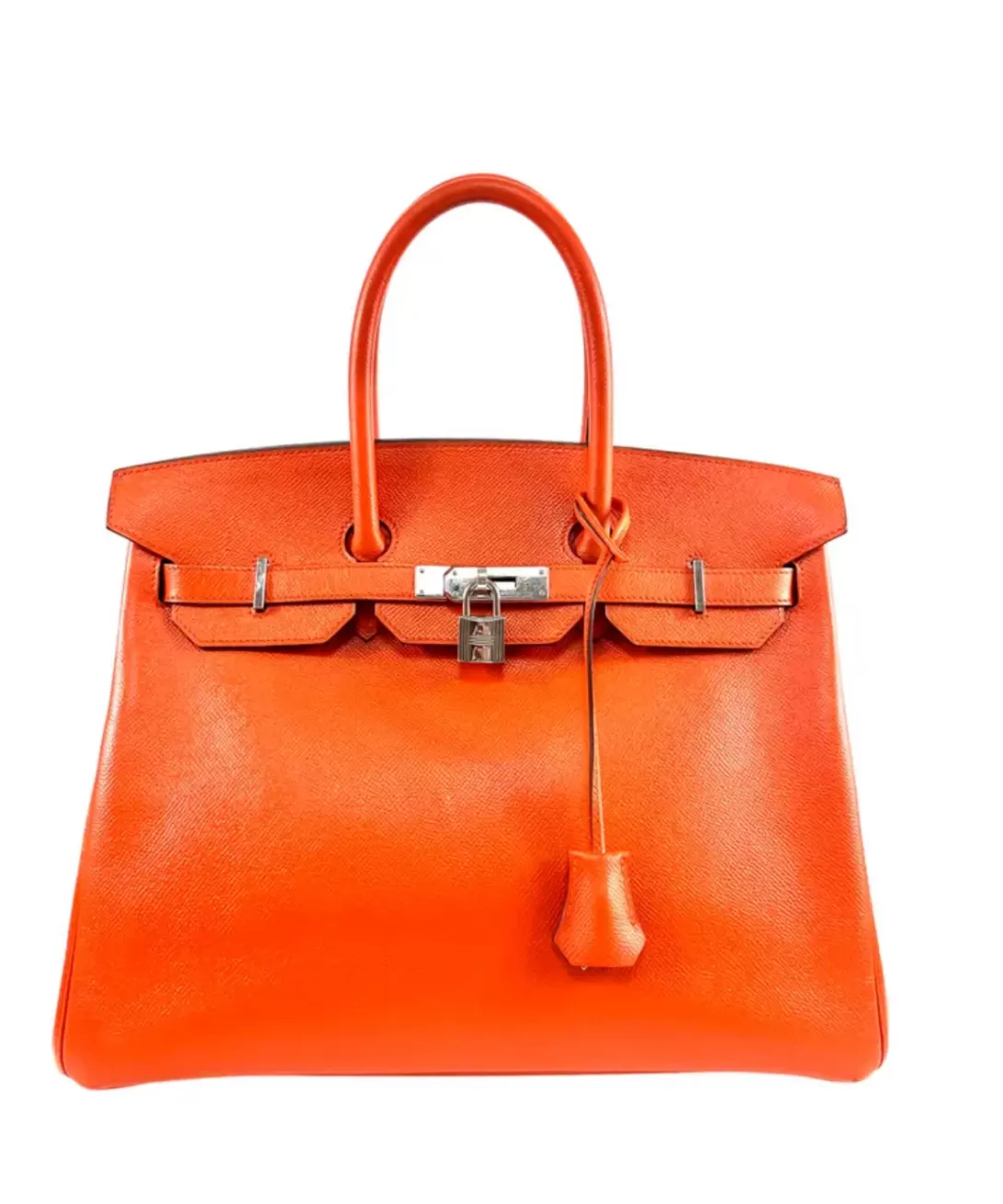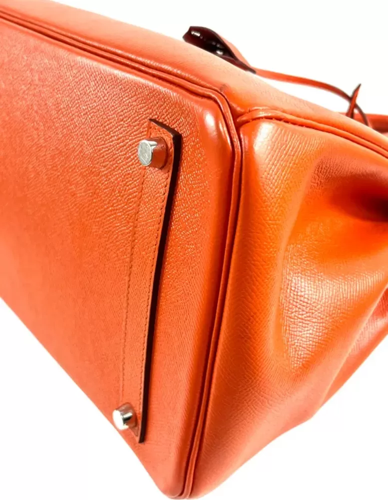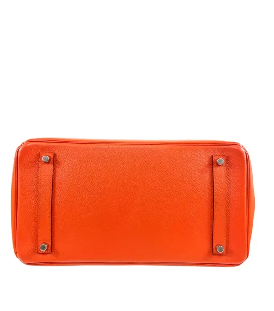 Sac « Birkin » 35cm en veau Epsom orange, attaches et fermoir en métal argenté palladié, double poignée, clefs sous clochette, cadenas.