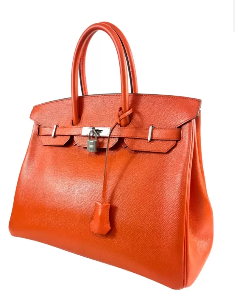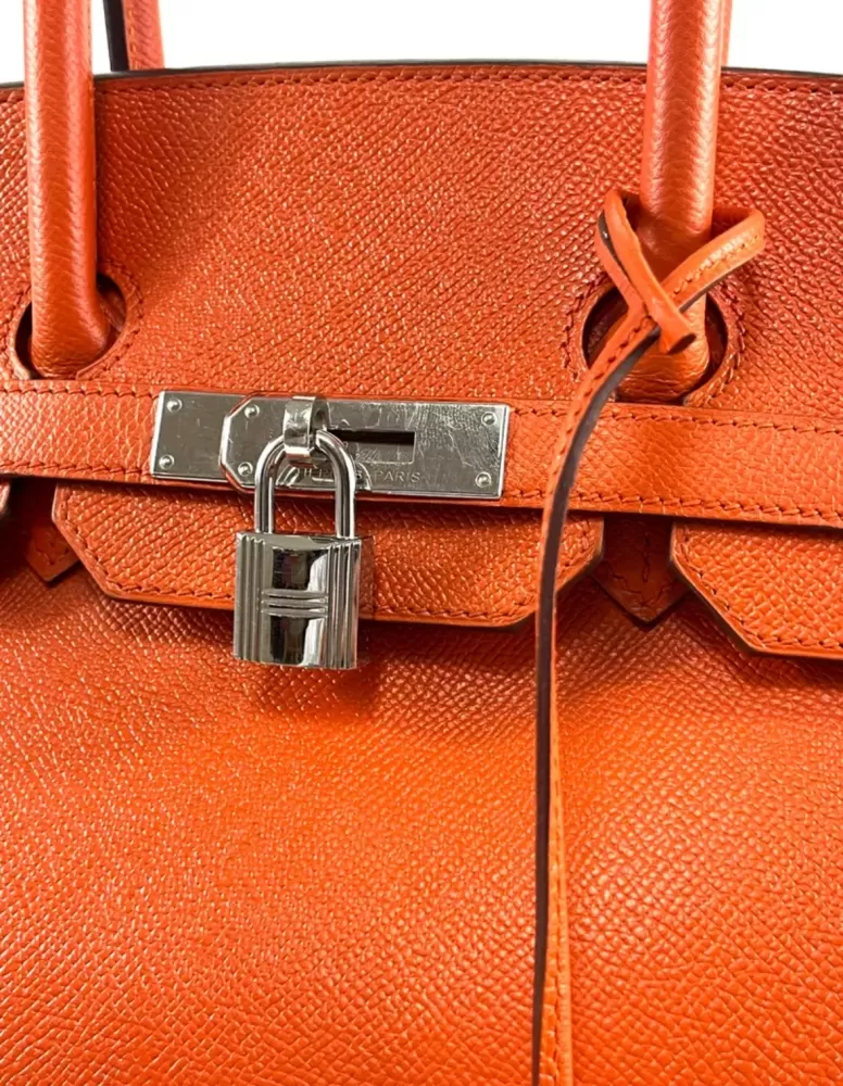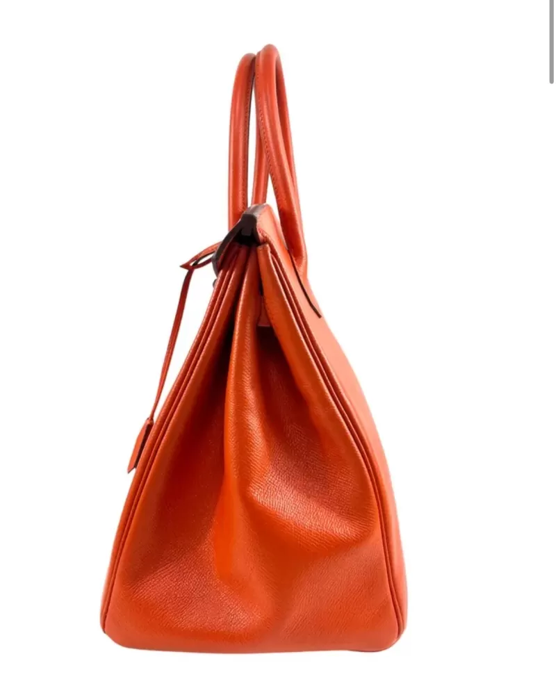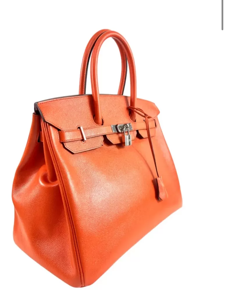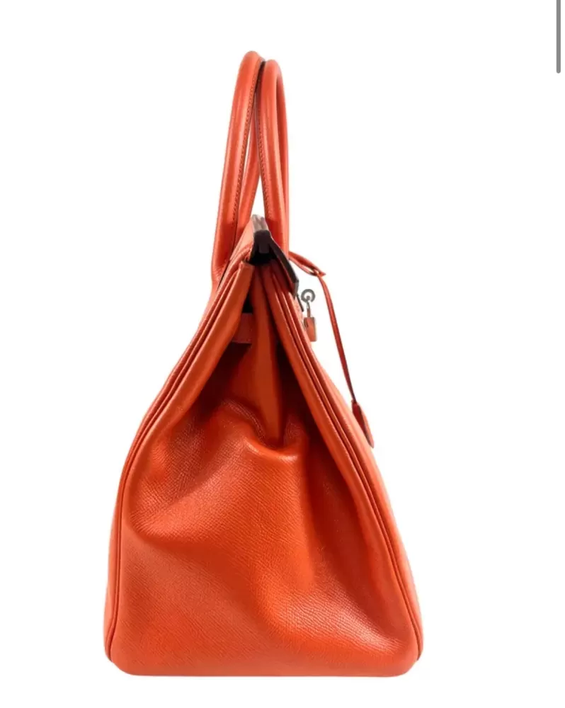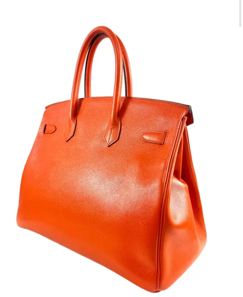 Sac « Birkin » 35cm en veau Epsom orange, attaches et fermoir en métal argenté palladié, double poignée, clefs sous clochette, cadenas.