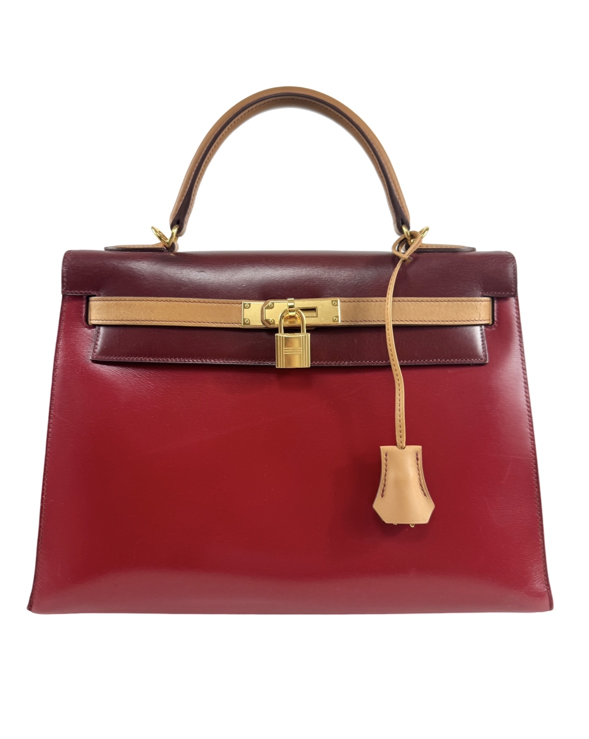 Sac « Kelly 33 Sellier » tricolore en box rouge H, gold, et garance, attaches et fermoir en métal doré, poignée, clefs sous clochette, cadenas.