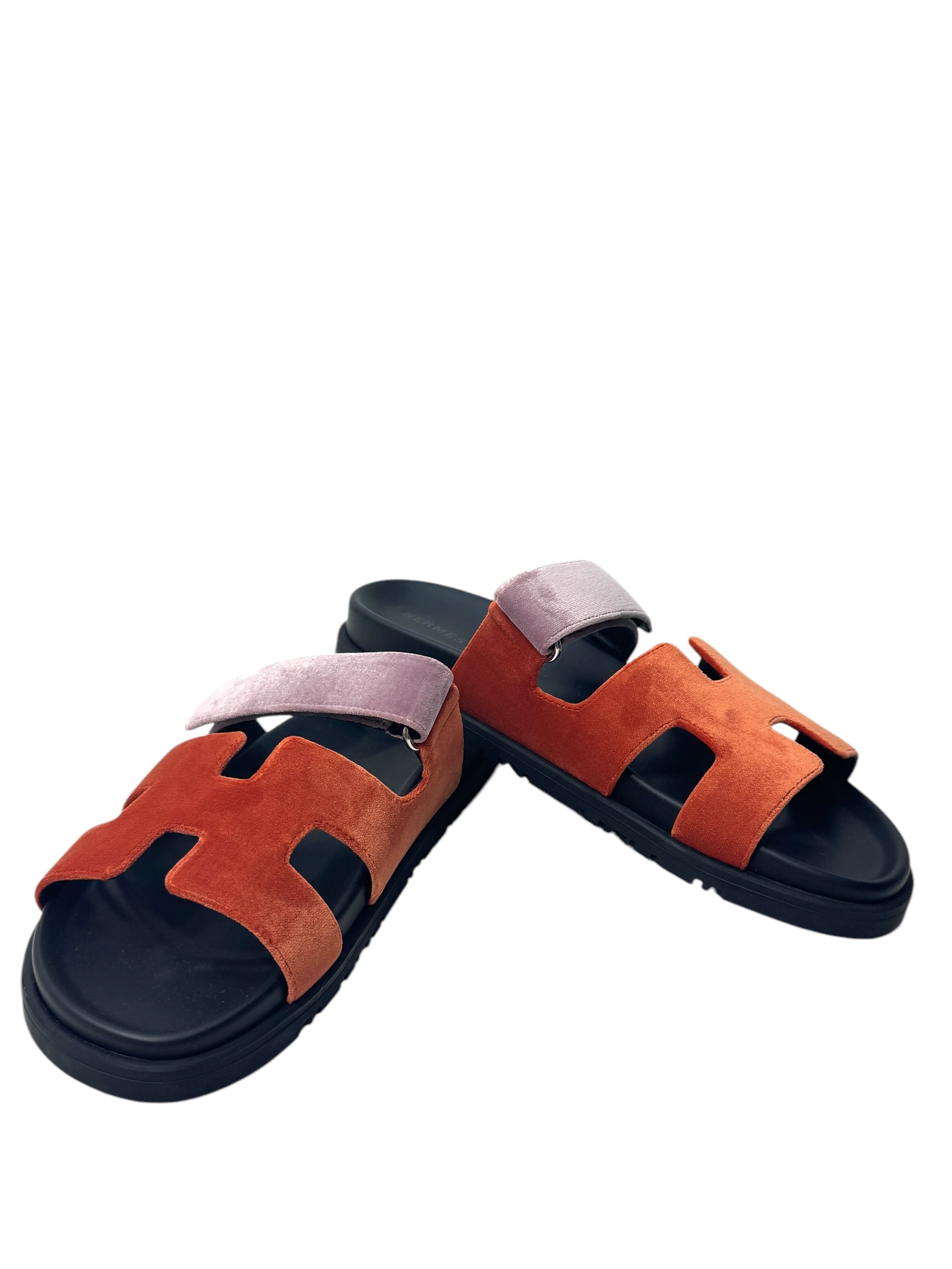 Sandales « Chypre » en cuir et velours dans les tons orange et violet sur une semelle anatomique en gomme noire, avec bride ajustable. Taille 40.