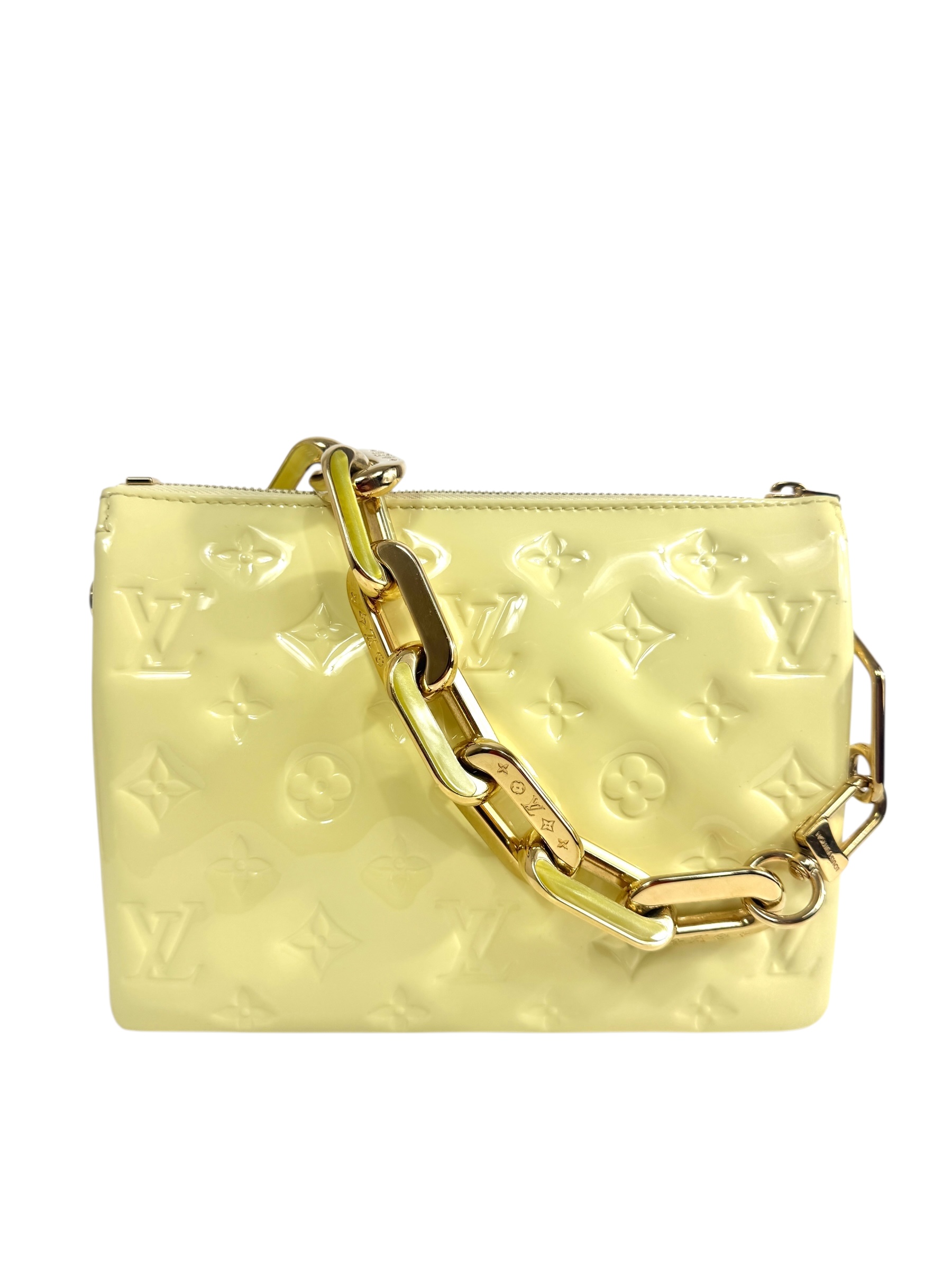 Sac « Coussin » en cuir verni Monogram et cuir agneau vanille, fermeture éclair, anse bandoulière amovible réglable, anse chaîne amovible. Puce RFID.