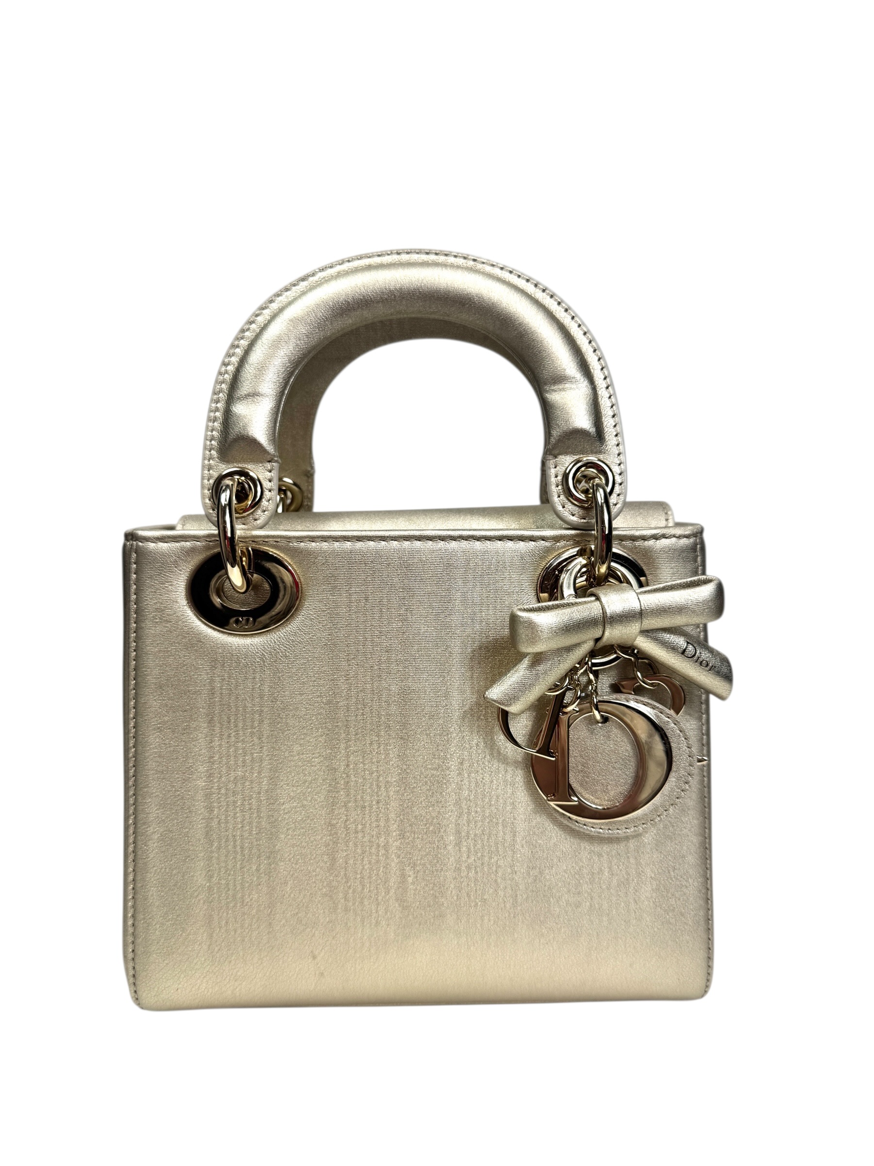 Sac « Lady Dior » mini en cuir agneau laminé or, rabat, double poignée dont une retenant des breloques abécédaires en métal doré, surmontées d’un nœud, anse bandoulière amovible.