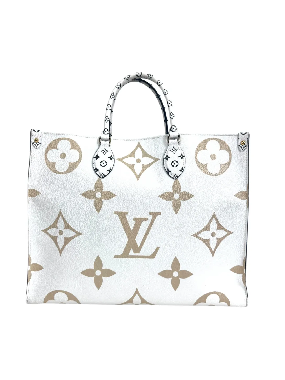 Sac « On The Go » en toile Monogram partiellement Giant kaki, blanc, beige, noir, double poignée, double anse d’épaule.